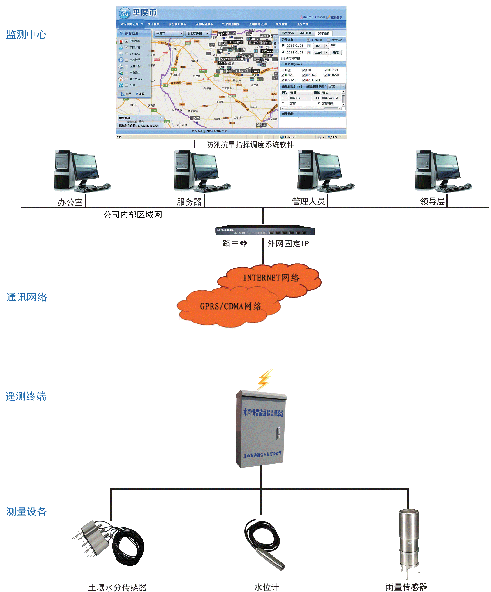 一、系統簡介 國家防汛抗旱指揮系統工程是關系到我國國民經濟可持續(xù)發(fā)展和人民生命財產安全的一項戰(zhàn)略性水利基礎設施建設,是國家水利信息化的主體工程。該工程的實施,對于提高我國防汛抗旱指揮調度決策現代化水平,減輕洪澇災害,保障人民群眾的生命財產安全,具有十分重要的意義和顯著的減災效益。 二、系統組成 v 監(jiān)控中心:中心服務器、外網固定IP、防汛抗旱指揮系統軟件; v 通信網絡: 基于移動無線GPRS或電信無線CDMA網絡; v 采集終端:水文水資源遙測終端RTU; v 計量儀表:雨量計、水位計、閘位計、土壤水分傳感器; v 供電方式:電池供電、太陽能供電、市電。