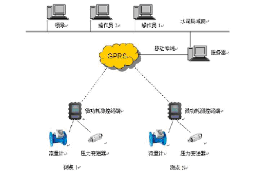 自來水廠調(diào)度中心、各職能部門之間數(shù)據(jù)通信在局域網(wǎng)內(nèi)完成;管網(wǎng)測點與自來水廠調(diào)度中心之間采用GPRS無線通信。