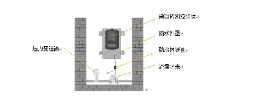 將防水外罩安裝在監(jiān)測井井壁上,微功耗測控終端放置在防水罩內(nèi)。壓力變送器信號線、水表信號線接在微功耗測控終端自帶的防水接線盒上。