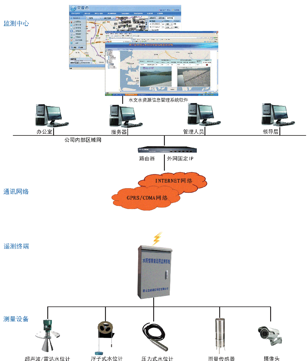 一、系統(tǒng)簡介 “水文水資源信息化管理系統(tǒng)”是一套率先以新的水文數(shù)據(jù)庫國家標(biāo)準(zhǔn)為基礎(chǔ)、采用了多項先進(jìn)技術(shù)應(yīng)用于水文信息化管理的應(yīng)用解決方案,將較大地提高雨情、水情、旱情和災(zāi)情信息的綜合利用率,為水文部門的調(diào)度決策提供科學(xué)依據(jù)。 二、系統(tǒng)組成 v 監(jiān)控中心:中心服務(wù)器、外網(wǎng)固定IP、水文水資源管信息化管理系統(tǒng)軟件; v 通信網(wǎng)絡(luò): 基于移動或者電信的通信網(wǎng)絡(luò)平臺、北斗衛(wèi)星; v 遙測終端:水文水資源遙測終端RTU v 測量儀表:水位計、雨量傳感器、攝像頭; v 供電方式:市電、太陽能供電、電池供電。